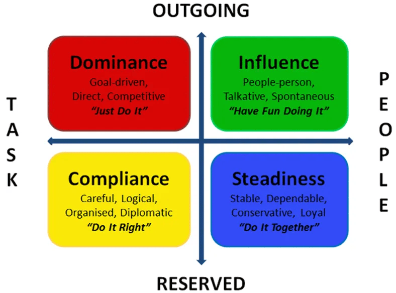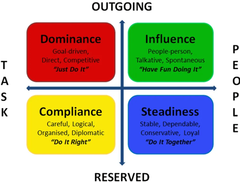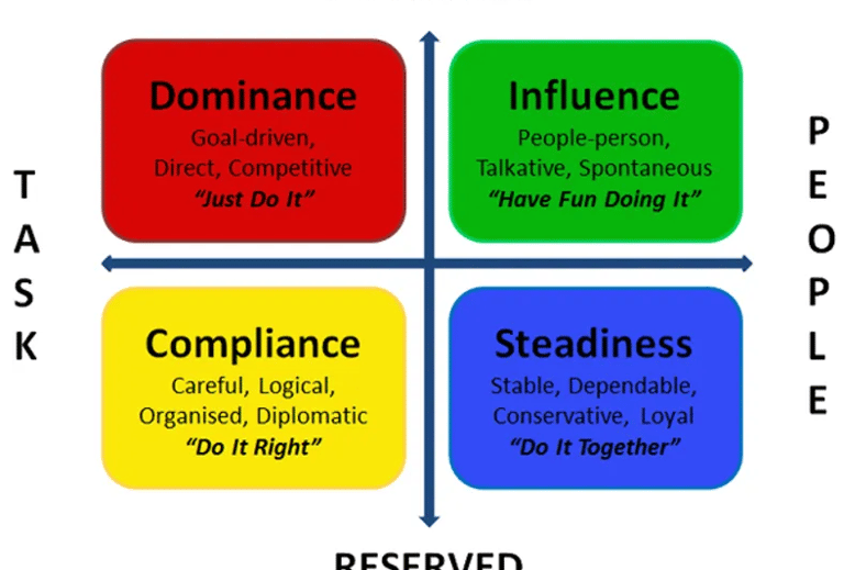Tôi may mắn được tiếp cận kiến thức DISC (Dominance – Influence – Steadiness – Compliance), dùng để đánh giá tính cách con người. Mô hình này được dùng rất nhiều trong quản lý nhân sự.